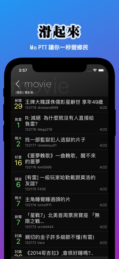Mo PTT提供最直覺的操作介面,讓你在手機上也能夠輕鬆的瀏覽PTT,出門在外再也不用擔心漏看任何PO文了!遇到好文想推就推,不用再匆匆忙忙趕回家開電腦推文!