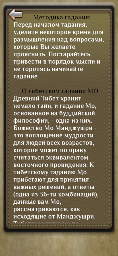 Древний Тибет хранит немало тайн, и гадание Мо, основанное на буддийской философии — одна из них. Божество Мо Манджушри — это воплощение мудрости для людей всех возрастов, которое может по праву считаться эквивалентом восточного провидения. К тибетскому гаданию Мо прибегают для принятия важных решений, а ответы (одна из 36-ти комбинаций), данные вам Мо, рассматриваются, как исходящие от Манджушри. Тибетское гадание по системе «Мо» существует на протяжении веков и дает возможность заглянуть в будущее, предугадать повороты событий и отношений. Это ясный и простой метод, чтобы прояснить наиболее важные сферы жизни и получить совет, как наиболее благоприятно решить конкретное дело.