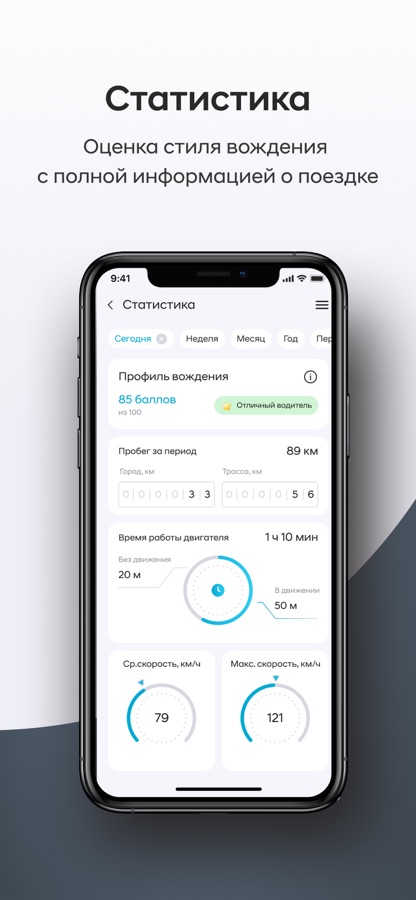 — Статистика эксплуатации (количество часов в режиме движения, в режиме парковки, средняя и максимальная скорость, оценка стиля вождения).