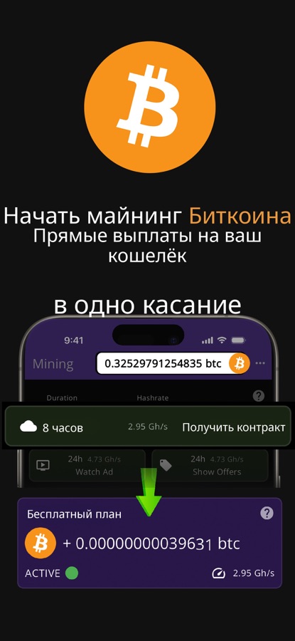Присоединяйтесь к более чем 1 млн довольных майнеров, которые уже используют наше приложение для майнинга биткоина и начинают с одного нажатия. Забудьте о дорогом оборудовании и счетах за электричество: мы предоставляем продвинутый хешрейт биткоина, чтобы вы могли сосредоточиться на важном. Вступайте в одно из самых удобных криптосообществ и выводите вознаграждения в BTC на свой кошелек при соблюдении минимальных требований.
