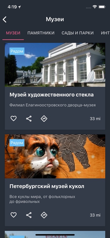 В мобильном гиде — более 2200 интересных мест и сотни различных событий. Удобный рубрикатор поможет выбрать то, что интересно именно вам. В разделе «Афиша» страница каждого события привязана к странице места, где оно проходит.
