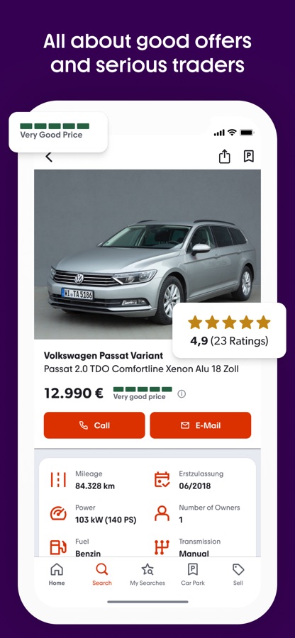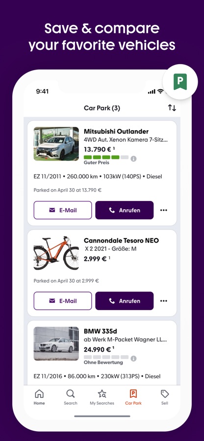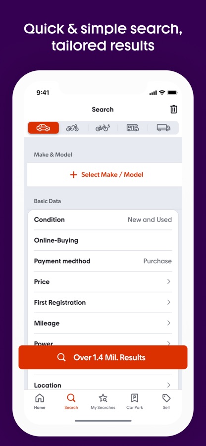 The mobile.de app helps you keep track of everything. Conveniently browse for bargains on the go, save your search(es), mark your favourites in your personal car park and receive notifications about new listings. If you’re logged in, your saved vehicles and searches will be automatically synchronised across all devices.