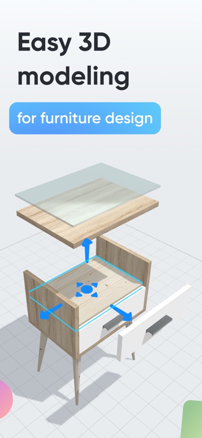Соберите будущую мебель в трёхмерном пространстве с помощью интуитивно понятного интерфейса и готовых к использованию элементов (простые формы/ножки/ручки).