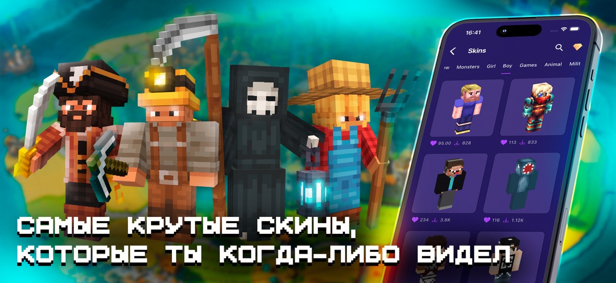 Получите тысячи уникальных скинов, модов и аддонов для Minecraft PE — все в одном мощном, простом в использовании приложении! Создавайте и исследуйте бесконечные миры!
