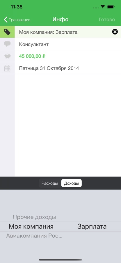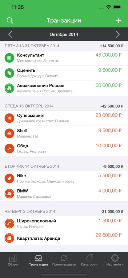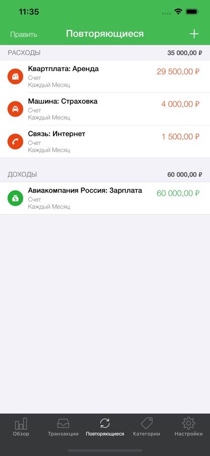 2. После ввода доходов или расходов в приложение, на экране появляется список с суммой остатка на каждый день. Для дополнительного удобства в приложении также имеется возможность однократно вводить повторяющиеся транзакции.