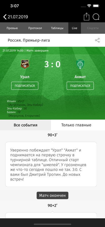 — текстовые трансляции всех встреч Российской футбольной премьер-лиги;