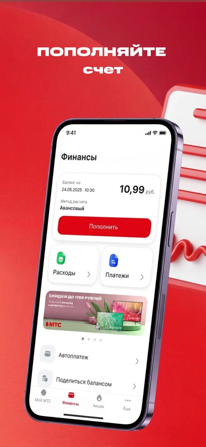 – пополнять счёт, подключать и настраивать автоплатежи, вносить платежи по рассрочке.