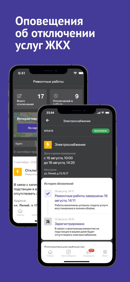 Узнавайте об отключениях электричества, отопления, холодной и горячей воды. В приложении всегда доступна актуальная информация по ремонтным работам для всей федеральной территории «Сириус». Подпишитесь на интересующие вас адреса и получайте звуковые уведомления с информацией по плановым и аварийным отключениям в вашем доме.