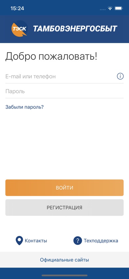 Если Вы зарегистрированы в Личном кабинете на сайте ПАО «Тамбовская энергосбытовая компания», для входа в приложение Вам достаточно использовать указанный Вами при регистрации номер телефона или e-mail и пароль.
