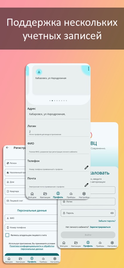 Возможность передавать показания по любым прибором учета, зная только лицевой счет. Возможность привязывать несколько учетных записей и управлять ими по отдельности. Сохранение истории о приборах учета, по которым Вы передали показания, что позволяет не вводить одни и те же данные по нескольку раз. И много другое! Получайте Push-уведомления (пользователям будут приходить уведомления об отключениях коммунальных услуг, напоминания о необходимости передать показания приборов учета и другая важная информация).