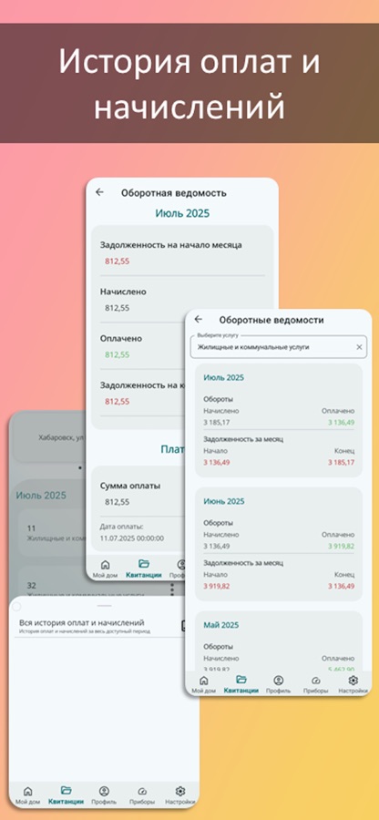 Просматривайте сколько было начислено, какая задолженность (переплата) и сколько было оплачено за выбранный месяц. Так же можно посмотреть детализацию платежа.