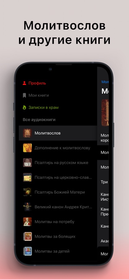 Множество православных аудиокниг с текстом и звуком, среди них: Молитвослов, Псалтирь, Великий покаянный канон Андрея Критского, молитвы на всякую потребу, за болящих, за детей, акафисты Иисусу, Богородице и Святым, церковные песнопения, 77 книг Библии в шикарной озвучке Валерия Шушкевича (признана лучшей озвучкой синодального перевода)