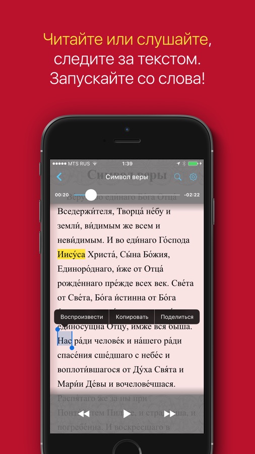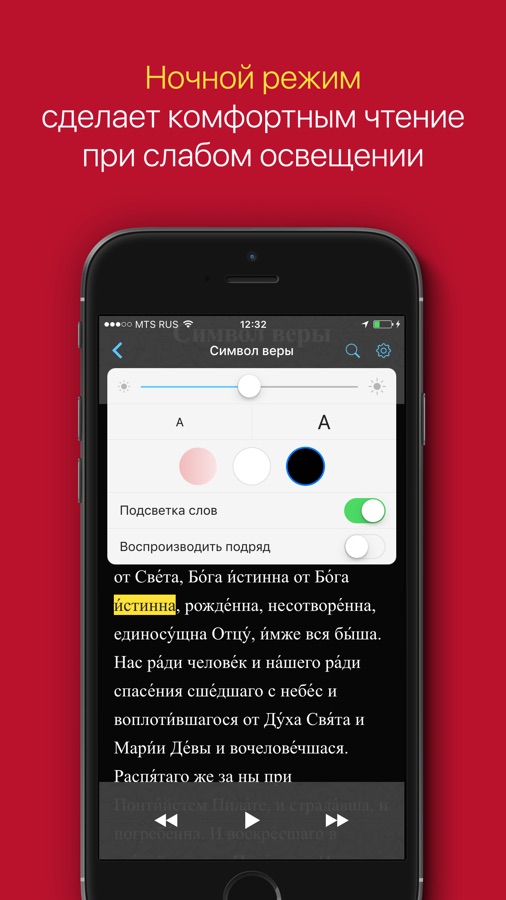 Подсветка произносимых в аудиозаписи слов позволяет следить за текстом, помогает лучше понимать и запоминать молитвы.