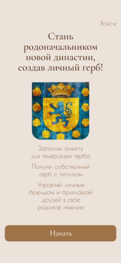 Достаточно заполнить небольшую анкету, после которой приложение сгенерирует герб, исходя из ваших интересов, личных качеств и происхождения. После получения уникального герба вы можете управлять им в социальной сети и приглашать своих друзей, знакомых, родных, коллег создать свои.