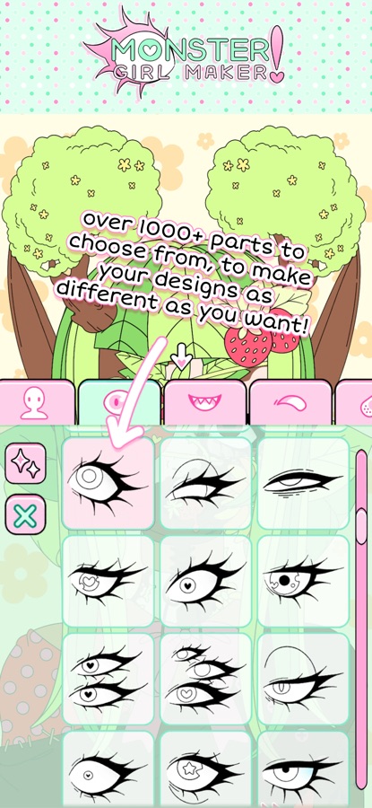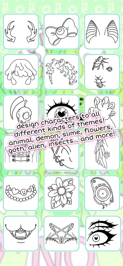 Monster Girl Maker is a character creator where you can design a variety of portraits using over 1000 different parts; skin, eyes, mouth, eyebrows, hair, accessories, clothes and more. This app allows you to create monsters with slime, stitches, horns, multiple eyes, wings and much more!