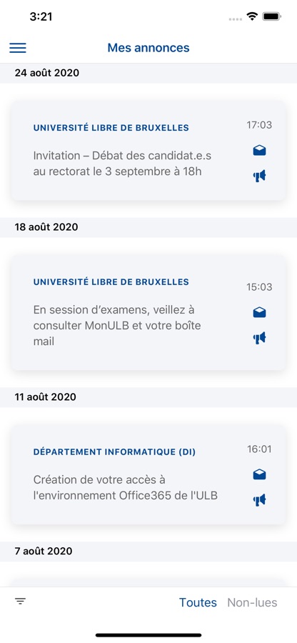 Consulter vos horaires de cours, recevoir vos notes d’examens et annonces facultaires dès leur publication sur votre smartphone ou sur votre tablette? C’est possible grâce à l’appli mobile MonULB destinée aux étudiants. Téléchargez-la gratuitement et découvrez plein d’autres fonctionnalités!