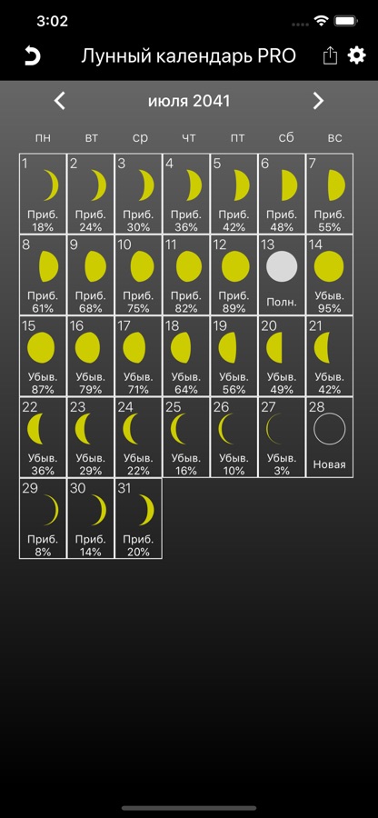Этот лунный календарь показывает фазу и процент видимости Луны на любой календарный день. Загрузите приложение бесплатно прямо сейчас!