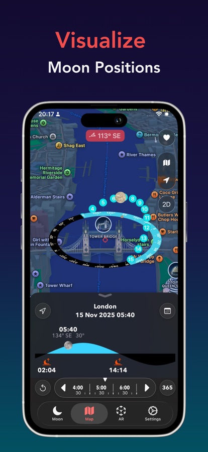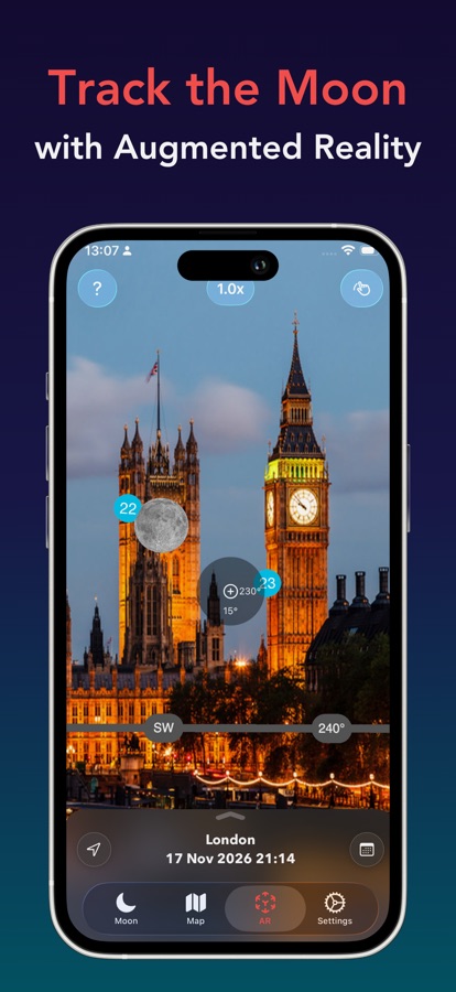 An augmented reality projection of the moon’s position at your current location.