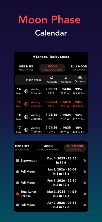 Moon Tracker is a modern, easy-to-use moon tracking app with an intuitive and sleek interface, providing access to a comprehensive range of professional functionalities.
