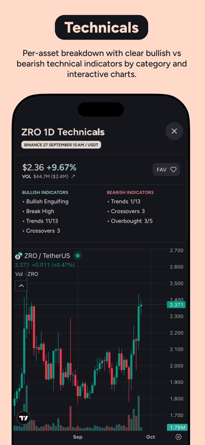 Technicals — Per-asset view with bullish vs bearish technical indicators by category and an interactive chart.