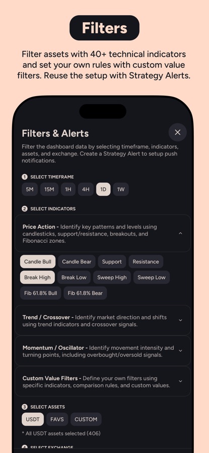 Filters — 40+ technical indicators and custom value filters; scope by assets and exchange; reuse with Strategy Alerts.