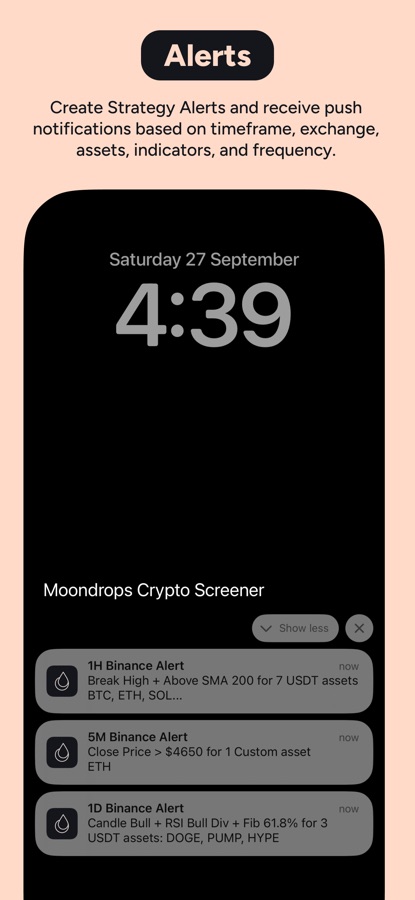 Alerts — Strategy Alerts via push notifications based on timeframe, exchange, assets, indicators, custom value filters (eg. price thresholds), and frequency (repeat or once).