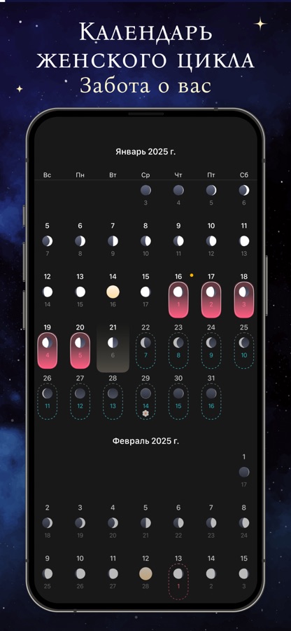 • Календарь-трекер женского цикла. Отслеживайте цикл и фазы луны для достижения гармонии и баланса;