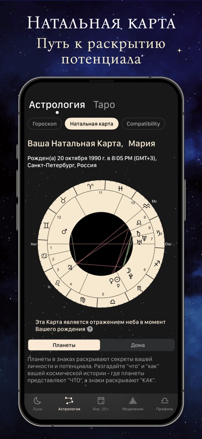 • Натальная карта: описание 12 планет в день вашего рождения и их влияние на ваш характер и судьбу;