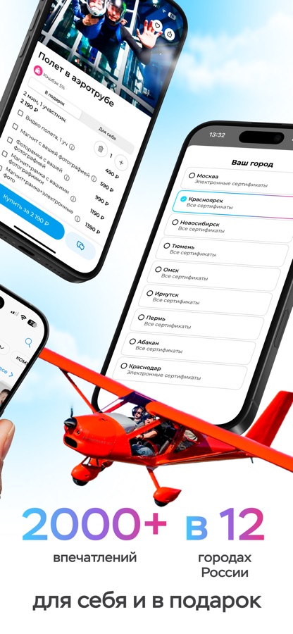 На что падёт твой выбор? Прыжок с парашютом или полёт в VR-шлеме в аэротрубе? Или ты рискнёшь встретиться с сибирскими Хаски и промчаться с ними в упряжке?