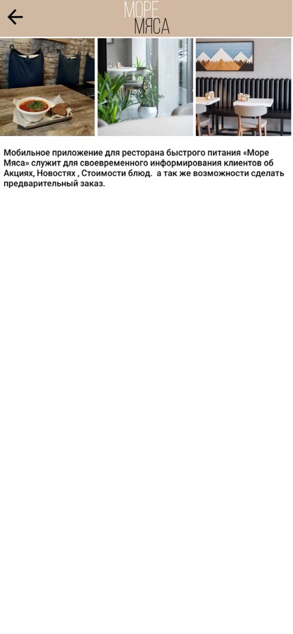 Мобильное приложение для ресторана быстрого питания «Море Мяса» служит для своевременного информирования клиентов об Акциях, Новостях , Стоимости блюд, а так же возможности сделать предварительный заказ
