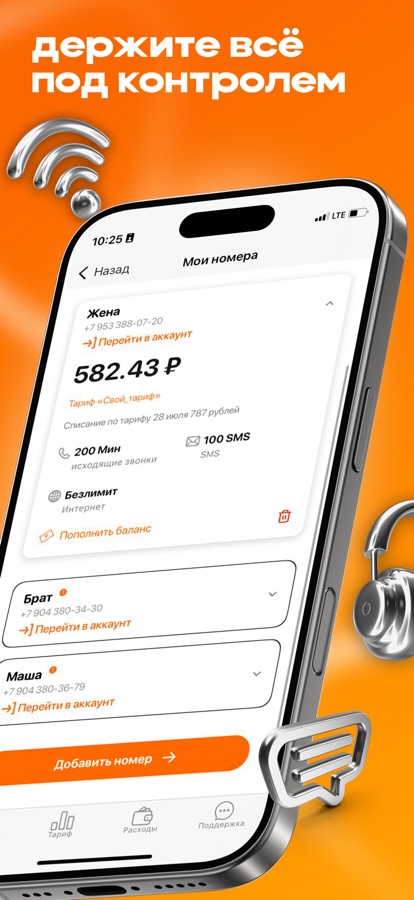 • Проверяйте баланс, дату списания и остатки по пакетам для всех номеров Мотив.