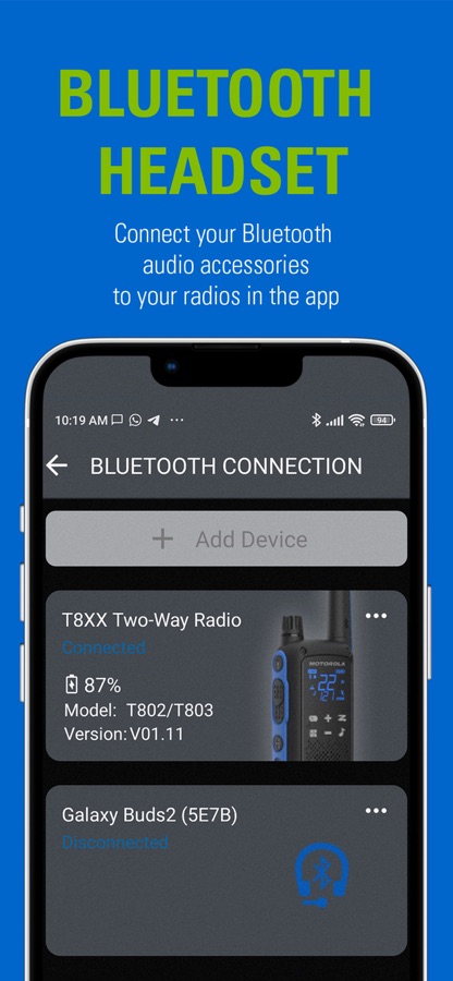 • Bluetooth connectivity to audio accessory (select radio models; T802 and T803 only)