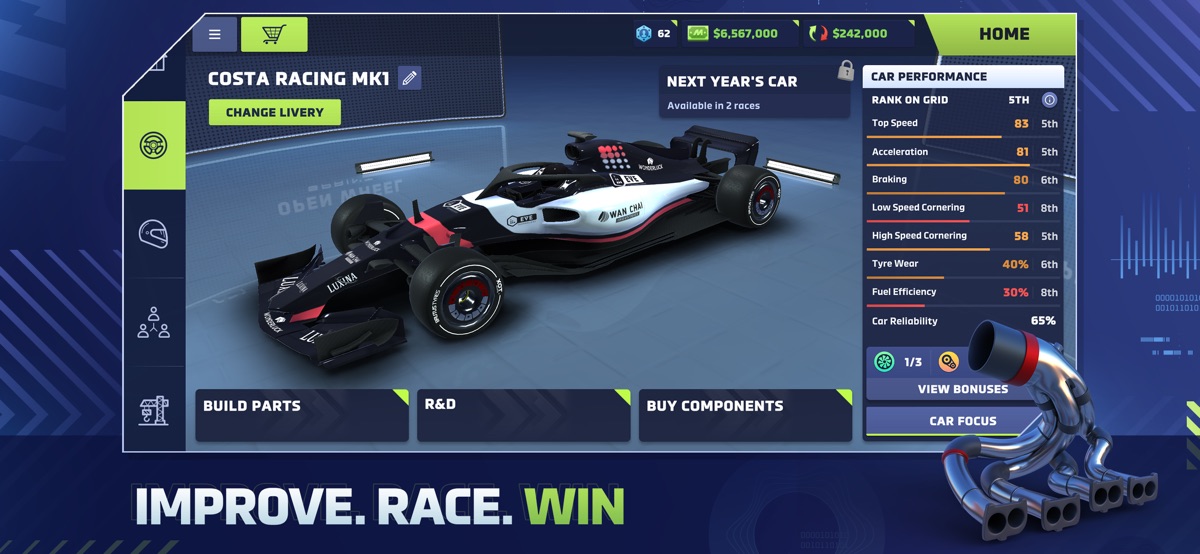 Step into the shoes of promising new drivers, delve into their statistics, and cultivate pivotal relationships. Navigate the revamped HQ, seize upgrade opportunities, and master the new part development system for an immersive journey.