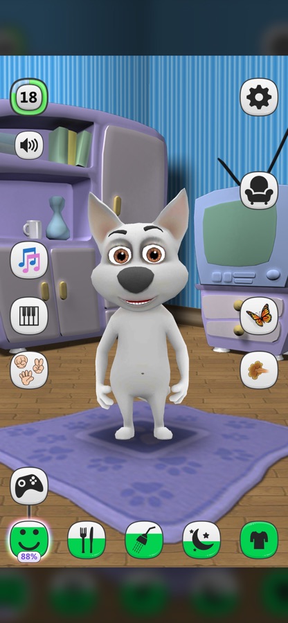 ПРИМЕЧАНИЕ: Вы можете играть с этой собакой набирая очки, и тем самым повысить свой уровень. Чем чаще вы будете играть с щенком, тем быстрее будете переходить на следующий уровень. На некоторых уровнях, вы можете получить подарки, в этом вам помогут забавные игры. Кроме того, все помещения оснащены энергетическими уровнями, которые должны заряжаться по истечении времени игры с собаки и заботы о ней.