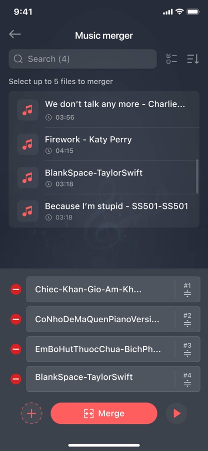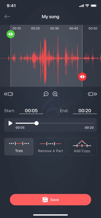 — Редактировать музыку, аудио с двумя вариантами: обрезать (удалить левую часть и правую часть) или удалить среднюю часть. Выберите части, установив начало и конец для аудиоклипа или используя дополнительный сенсорный интерфейс.