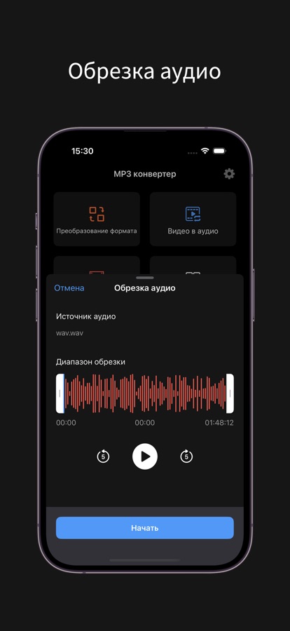 • Обрезка аудио: точно обрежьте аудиофайлы, удалите лишние части и сохраните фрагменты, которые вы хотите больше всего.