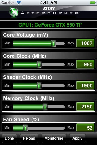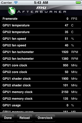 This iOS overclocking utility “Afterburner APP” was co-developed by MSI and well-known software programmer Nick Connors. This new Afterburner utility allows the iPhone, iPod Touch and iPad devices to adjust or monitor MSI Afterburner settings on PC over a Wi-Fi connection. In addition to monitoring the temperature, voltage and fan speed, the utility can also be used for overclocking and overvoltaging!