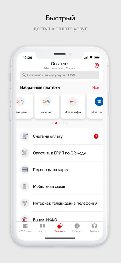 • оплачивать с баланса мобильного телефона МТС любые услуги системы «Расчет» (ЕРИП); • производить оплаты посредством QR-кодов любых услуг в ЕРИП;
