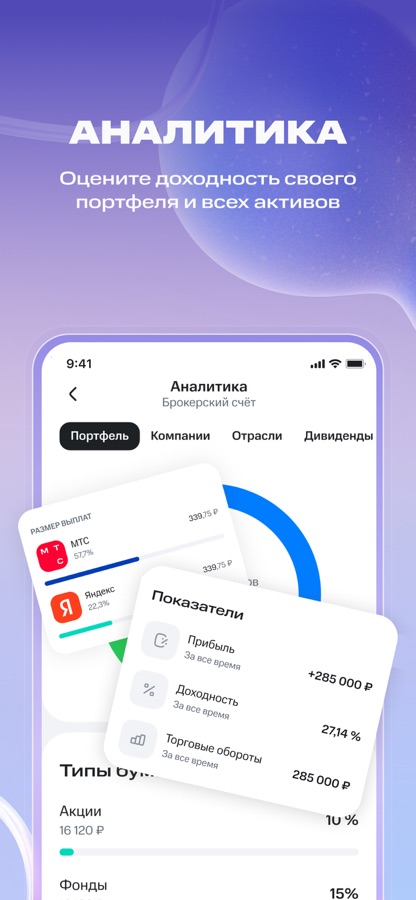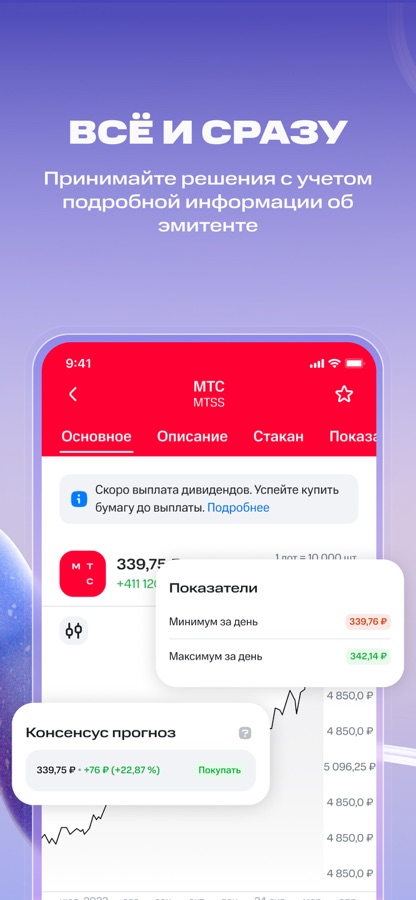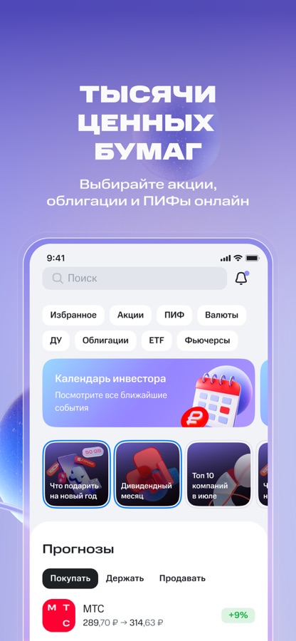 Получайте актуальную аналитику, в режиме реального времени смотрите котировки и прогнозы по акциям. Пользуйтесь календарём инвестора, чтобы планировать доход от ценных бумаг, первыми узнавайте об IPO и размещениях. А ещё проходите обучение и становитесь квалифицированными инвесторами прямо в приложении.