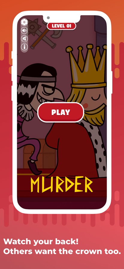 MURDER is a fun game of assassination. You wish to assassinate the king and take his place to rule over the kingdom. To start with, you must creep up behind the king and choose the opportune moment to strike and kill him. Once he is dispatched, you must quickly take his clothes and become the king yourself!