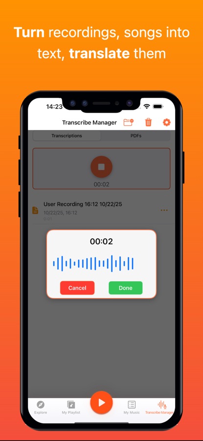 Manage your Transcriptions, PDFs, and Playlists effortlessly with a clean, modern interface.