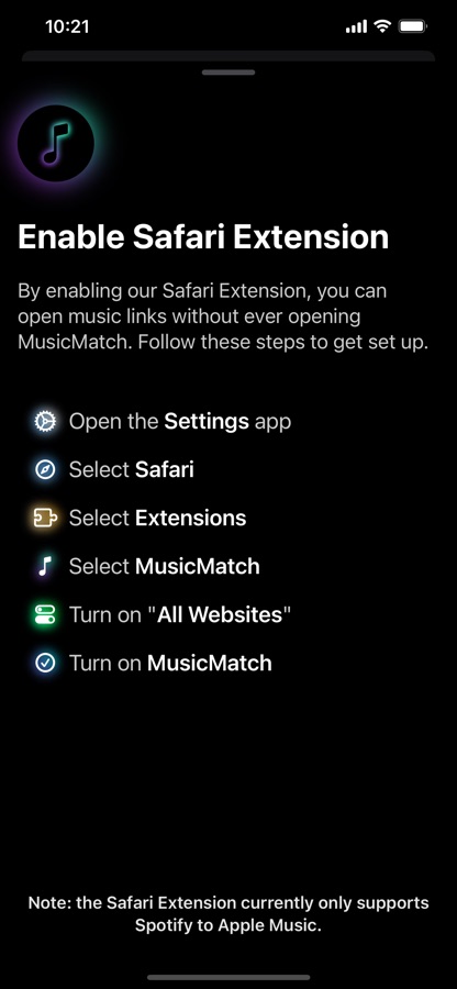 With the MusicMatch Safari Extension, you can open music links without ever opening the MusicMatch app. To get set up, follow the in-app instructions.