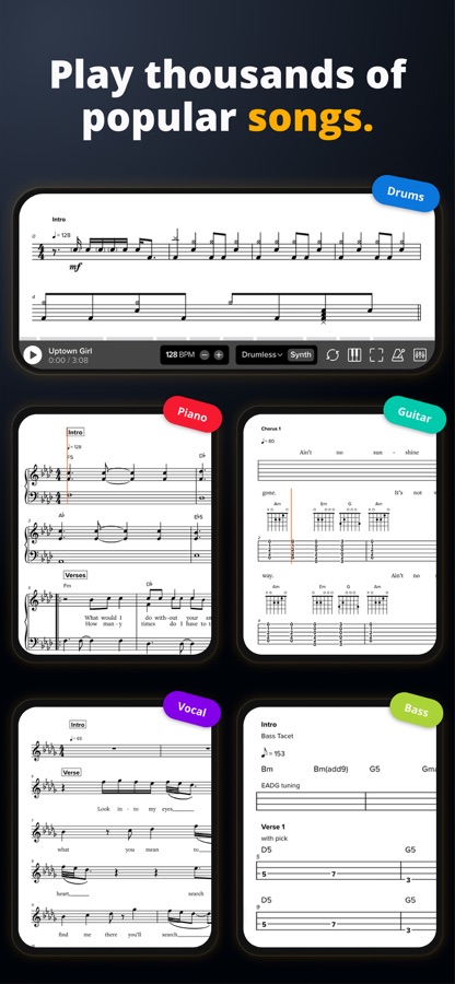 — Sheet music, drum charts, chord charts, and tabs so you can learn on any instrument