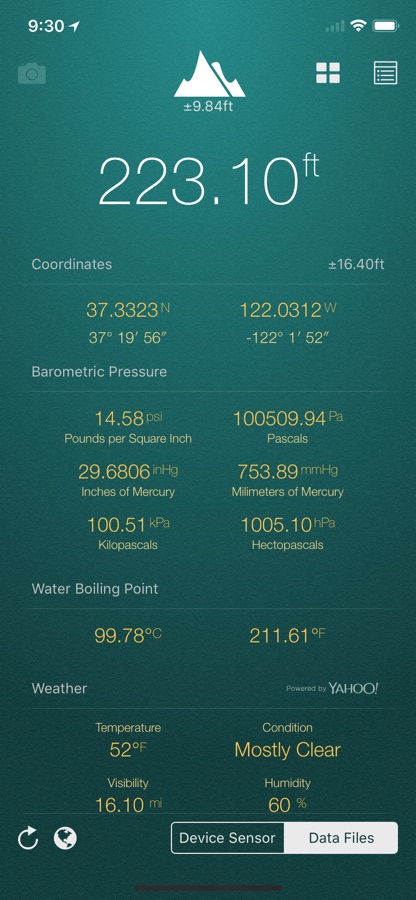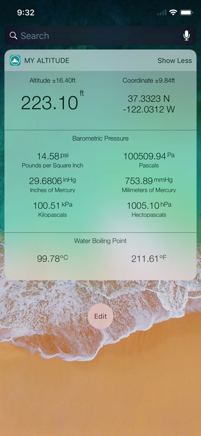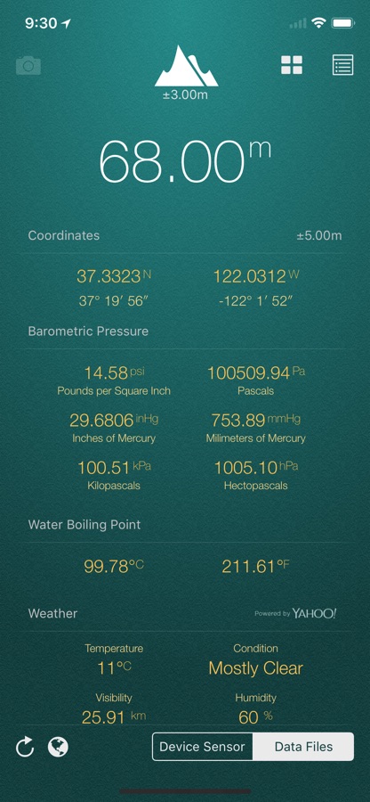 My Altitude uses GPS signals to determine your current location, showing your latitude, longitude and altitude (height from sea level) barometric pressure and water boiling point.