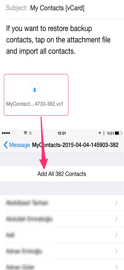 All contacts can then easily be restored any time by simply opening the .vcf file in your mailbox with iOS Mail app.