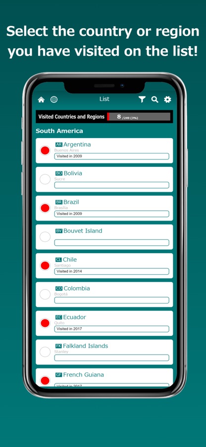 Это приложение показывает страны и регионы, которые вы посетили на карте мира! Отображая метки, вы можете легко найти страны и регионы на карте. Карту можно увеличить или уменьшить.