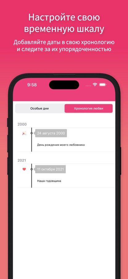 Персонализируйте Вашу Историю Любви: Добавляйте специальные даты, настраивайте напоминания так, как вам хочется — будь то ежедневно, еженедельно, ежемесячно или ежегодно. Не упустите возможность праздновать!
