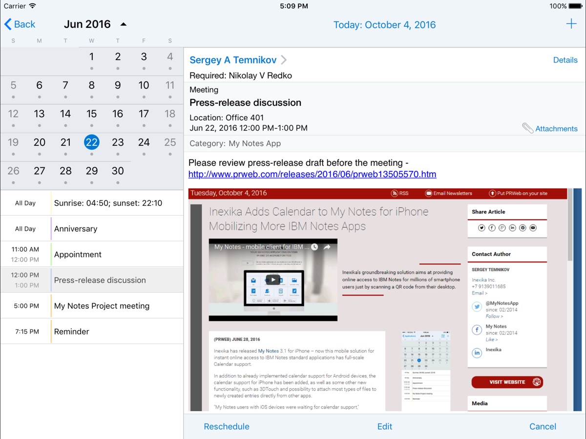 Приложение My Notes предназначено для работы со стандартными приложениями IBM Lotus Notes.