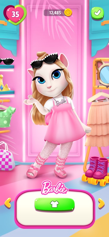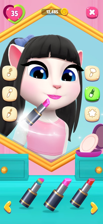 Мода в My Talking Angela 2 — это отдельная вселенная. Вы выбираете для кошечки не только платья и брюки, но и аксессуары: сумочки, очки, шляпки. Игра позволяет создавать полные образы от головы до хвоста, сохраняя их в альбоме стилей. Макияж наносится по зонам: вы вручную красите губы, накладываете тени и подводите глаза, экспериментируя с оттенками. Причёски создаются из десятков вариантов длины и цвета, а для сложных укладок доступны инструменты с поддержкой Apple Pencil на iPad. Интегрирует камеру AR: вы можете примерить на себя костюм, повторяющий образ Анджелы, и сделать смешное селфи для семейного альбома.