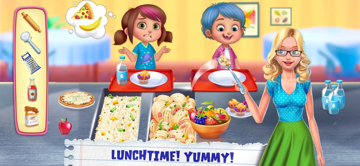 > > На обед вас ждут вкусные блюда и сладости в школьной столовой! Ты можешь приготовить пиццу и капкейки!